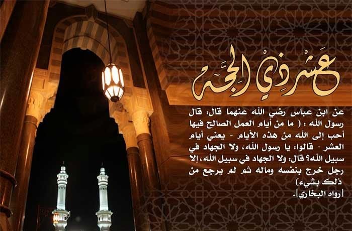 - ” ما مِنْ أَيَّامٍ الْعَمَلُ الصَّالِحُ فِيهَا أَحَبُّ إلى اللهِ مِنْ هَذِهِ الْأَيَّامِ» يَعْنِى أَيَّامَ الْعَشْرِ، قَالُوا: يَا رَسُولَ اللهِ، وَلَا الْجِهَادُ فِى سَبِيلِ اللهِ؟ قَالَ: وَلَا الْجِهَادُ فِى سَبِيلِ اللهِ، إِلَّا رَجُلٌ خَرَجَ بِنَفْسِهِ وَمَالِهِ، فَلَمْ يَرْجِعْ مِنْ ذَلِكَ بِشَيْءٍ”.