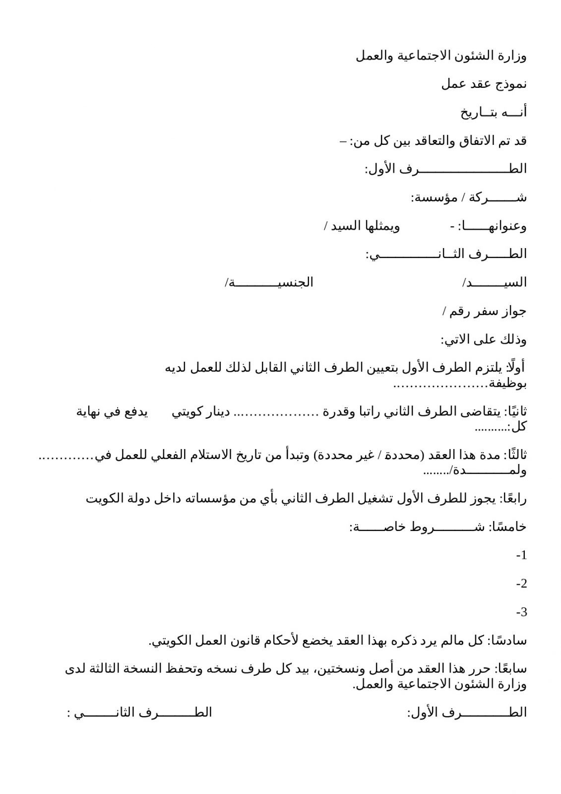 وزارة الشئون الاجتماعية والعمل بالكويت نموذج عقد عمل