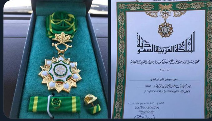 - كذلك وسام الملك عبدا لعزيز من الدرجة الأولى.