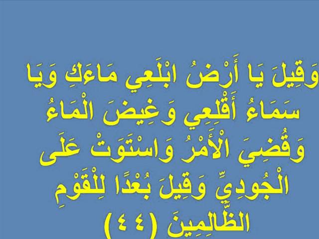 ذكرت آية وقيل يا أرض ابلعي ماءك في سورة هود، وهي من أحد السور القران الكريم والتي يبلغ عدد آياتها مائة وواحد وعشرون آية، وهي تقع في ترتيب الثاني والخمسون في المصحف، وقد نزلت بعد سورة يونس، وقبل سورة يوسف، وقيل يا أرض ابلعي ماءك في أي سورة هي كالتالي: