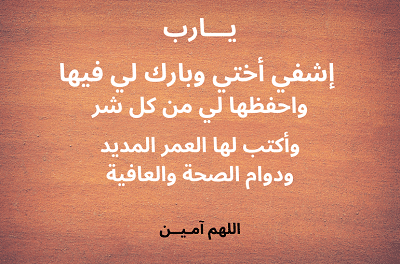 – أختي حبيبتي وقطعة من قلبي أسألك يا الله راحة قلبها وسلامة جسدها وتخفيف آلامها، يارب إشفي أختي من مرضها شفاء لا يغادر سقما يا أرحم الراحمين.