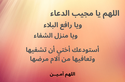 - أيضا اللهم يا مجيب الدعاء، ويا رافع البلاء، ويا منزل الشفاء، أستودعك أختي أن تشفيها وتعافيها من آلام مرضها.